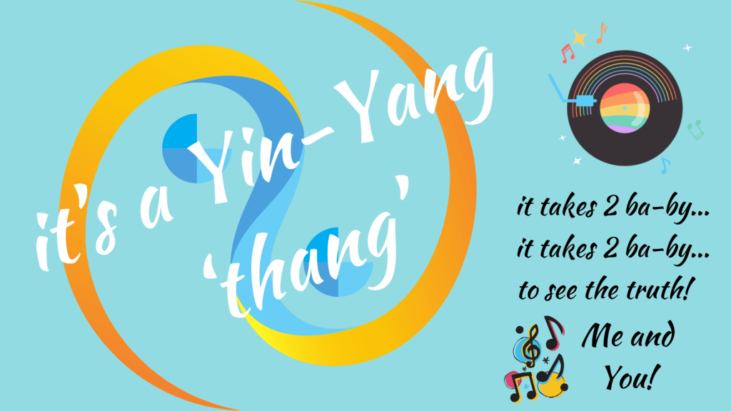 YIN: Consider this – change only happens when you understand what to change in the first place. And whatever you believe becomes your reality. Change your beliefs, change your reality. So make your ‘thang’ yin and yang. Takes two to see the truth.